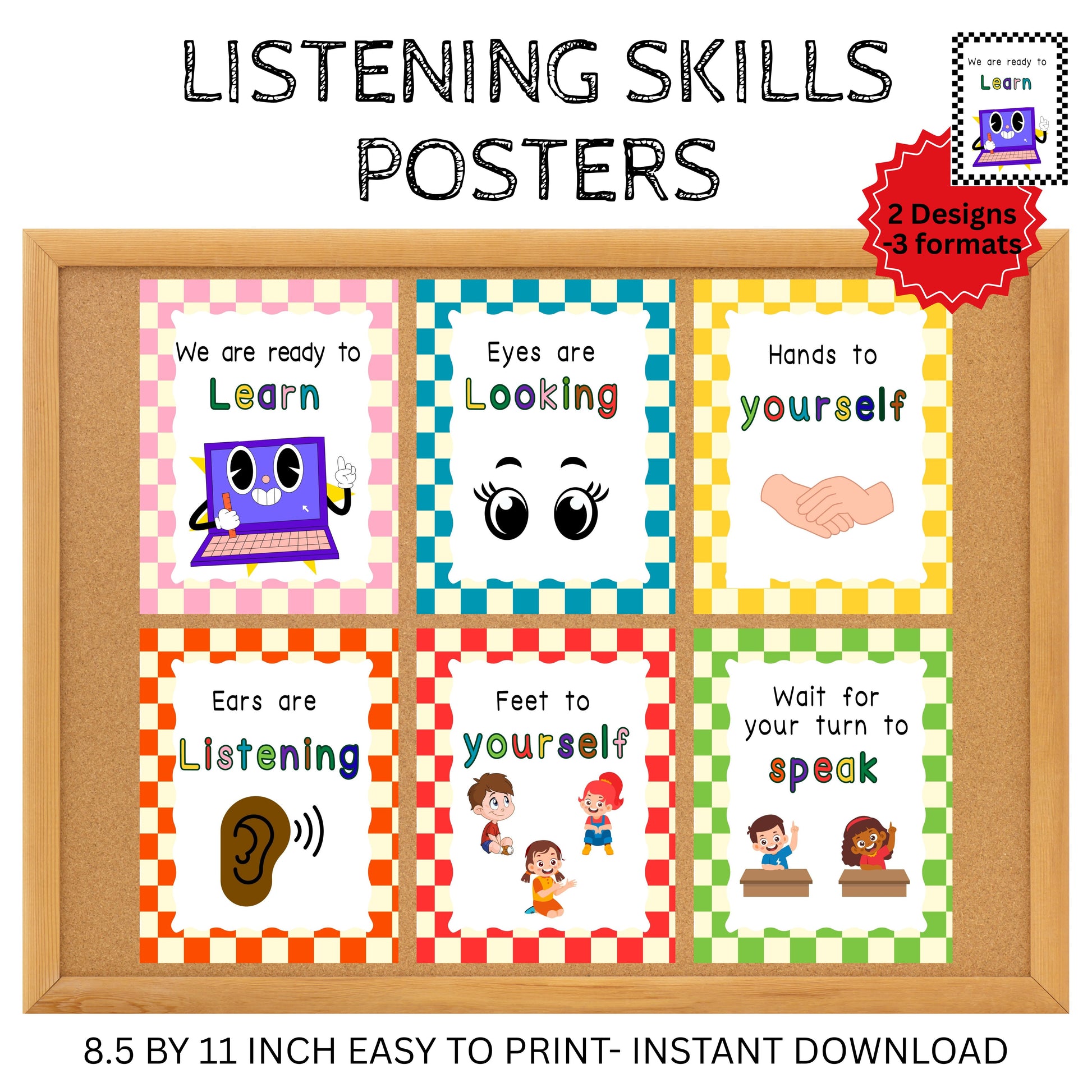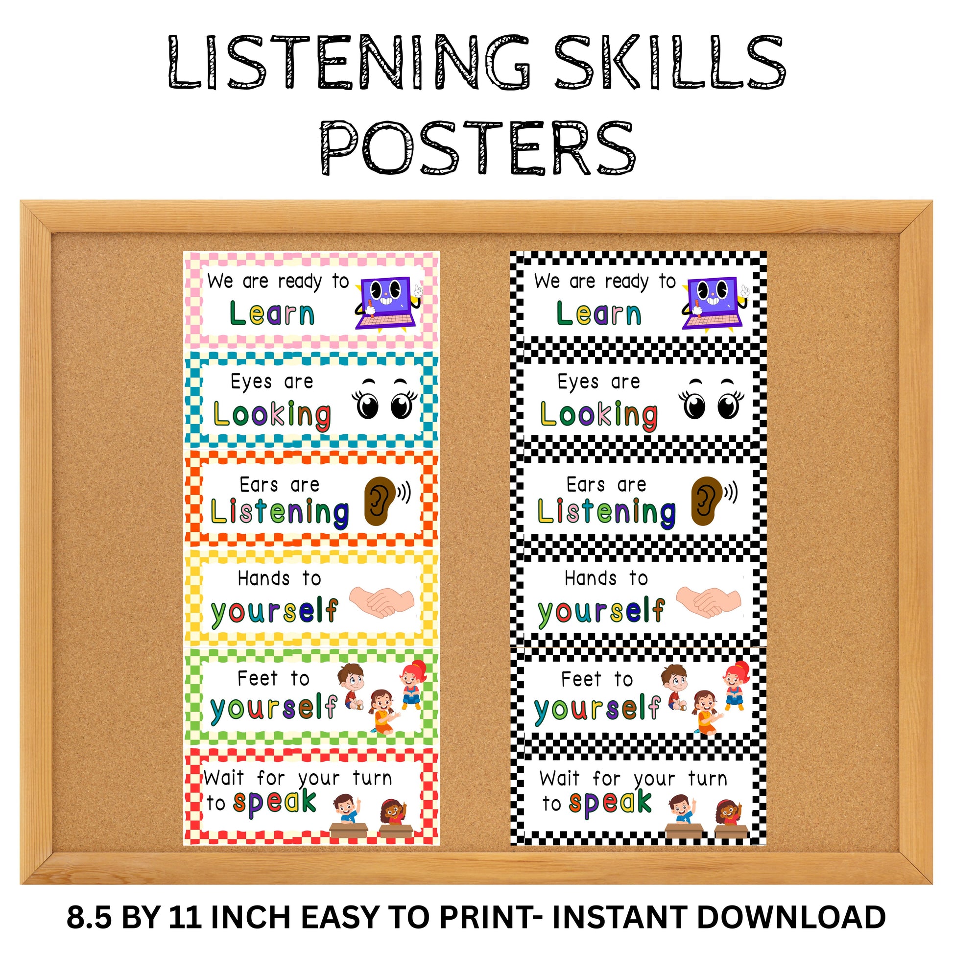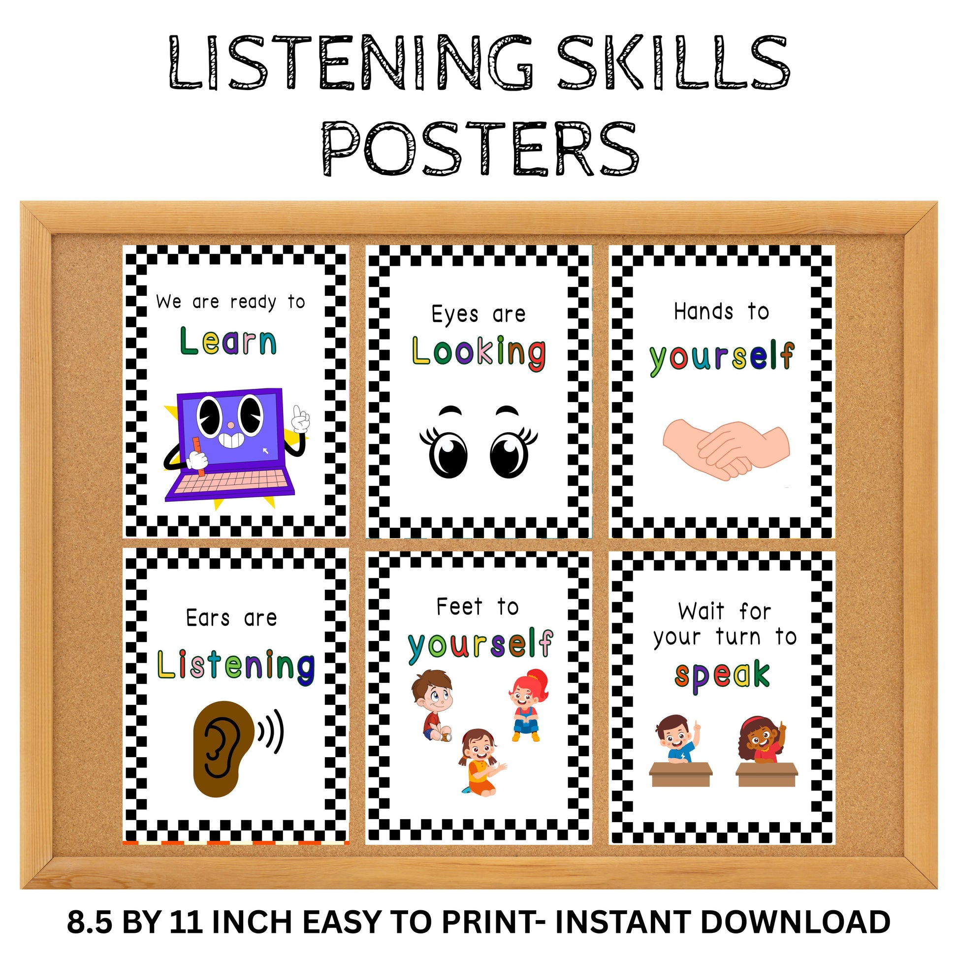 This instant digital download includes 6 illustrated listening posters designed to support positive behavior and listening skills in any classroom. Each poster features kid-friendly visuals and clear, simple phrases ideal for early learners, ESL students, or special education.