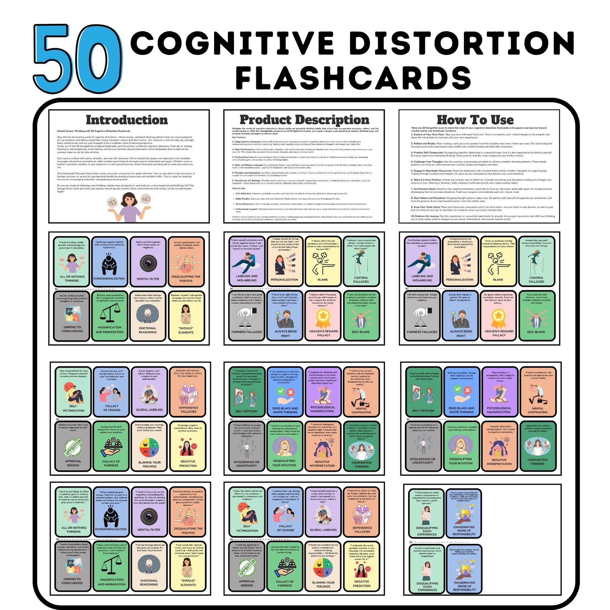 Transform your thinking patterns and boost emotional resilience with this set of 50 digital Cognitive Distortion Flashcards. Designed using the principles of Cognitive Behavioral Therapy (CBT), these printable therapy tools help you recognize, reframe, and respond to common thinking traps like all-or-nothing thinking, catastrophizing, and emotional reasoning.