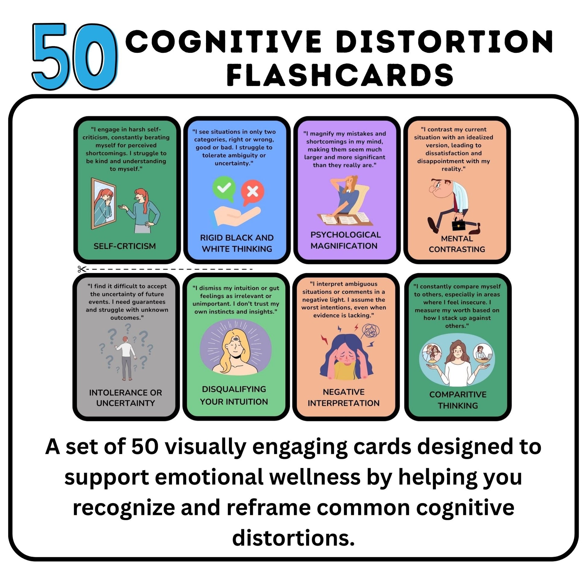 Each card highlights a specific cognitive distortion, along with relatable real-life examples and practical mindset-shifting strategies.