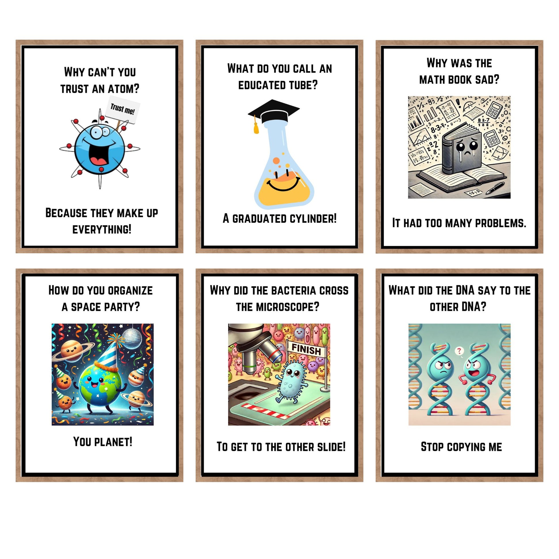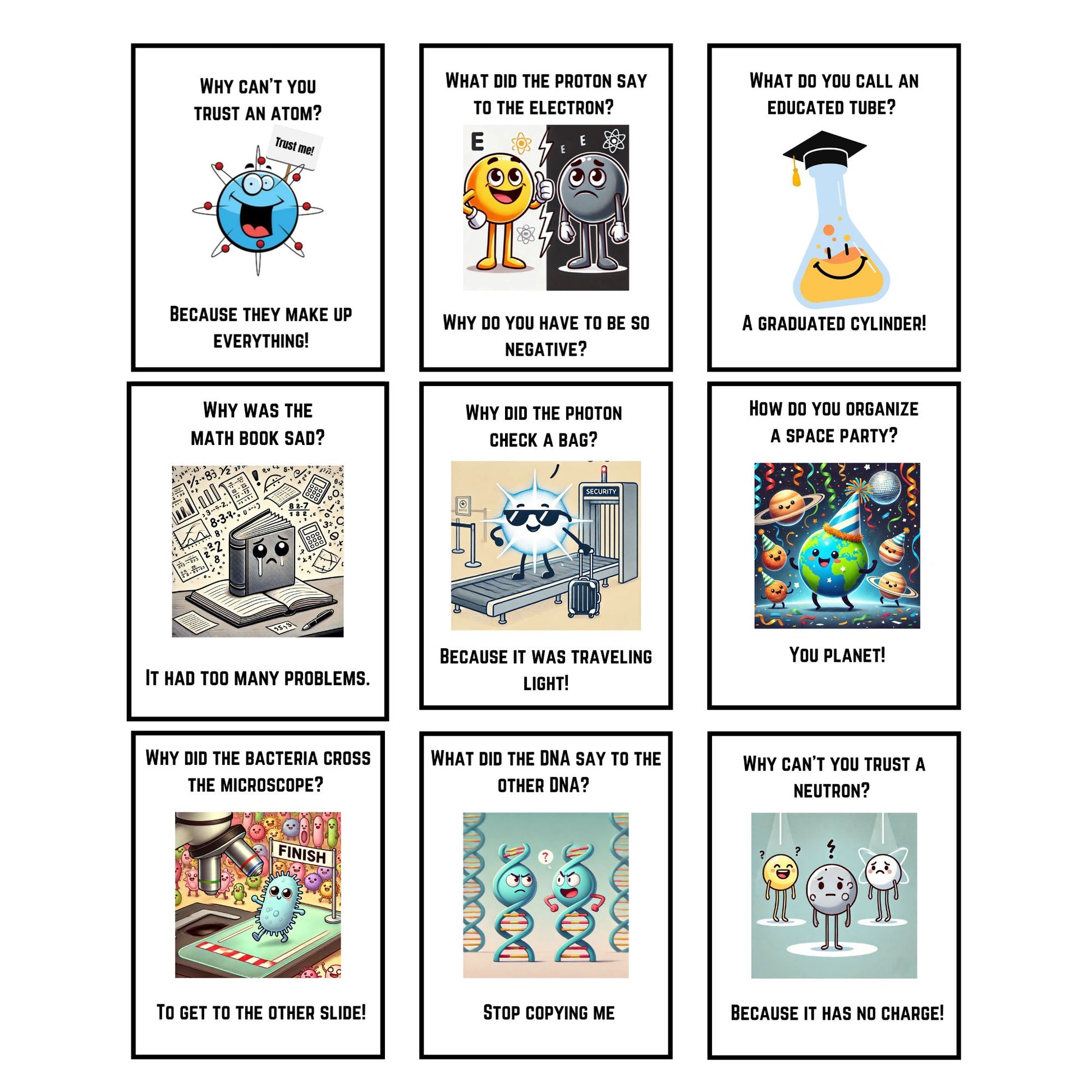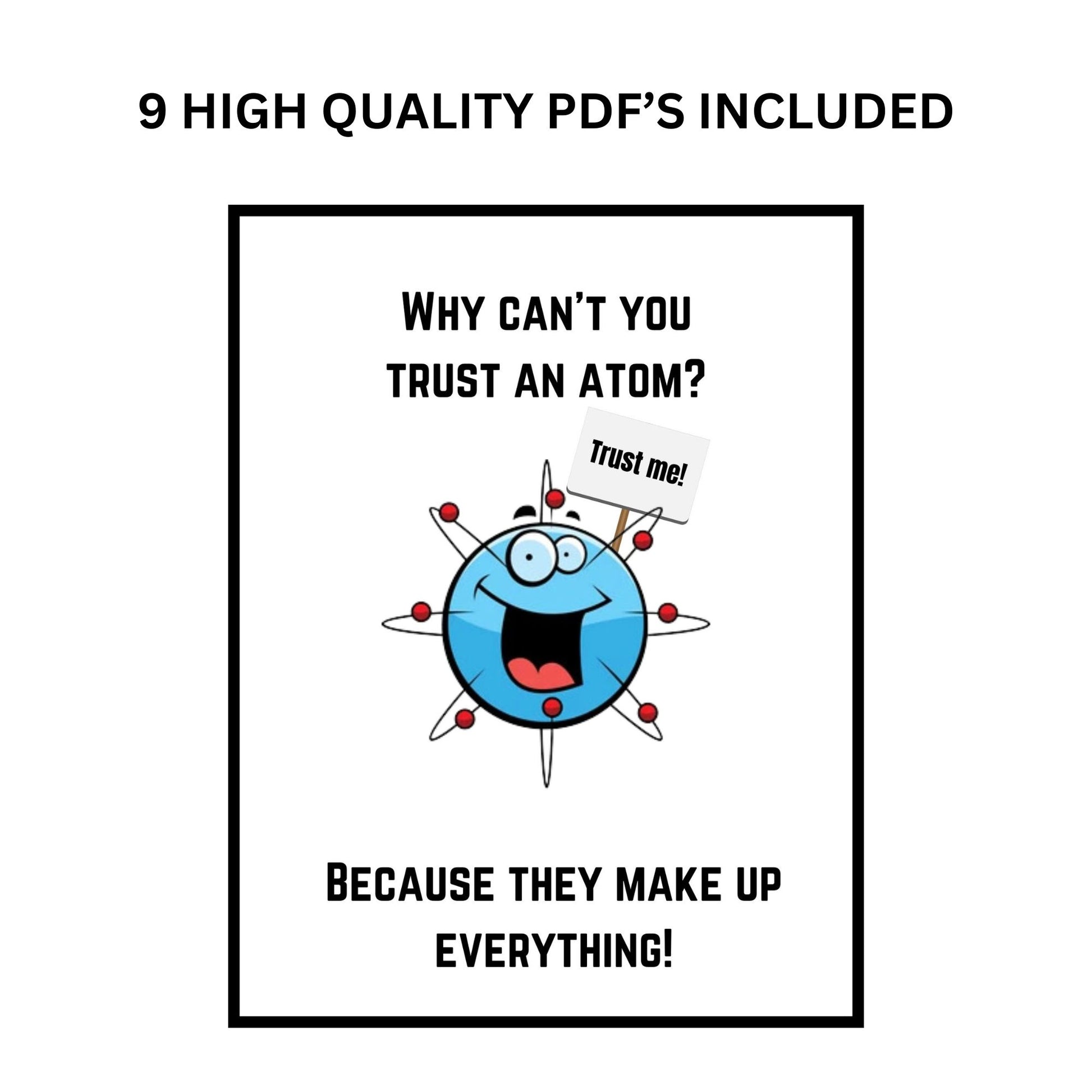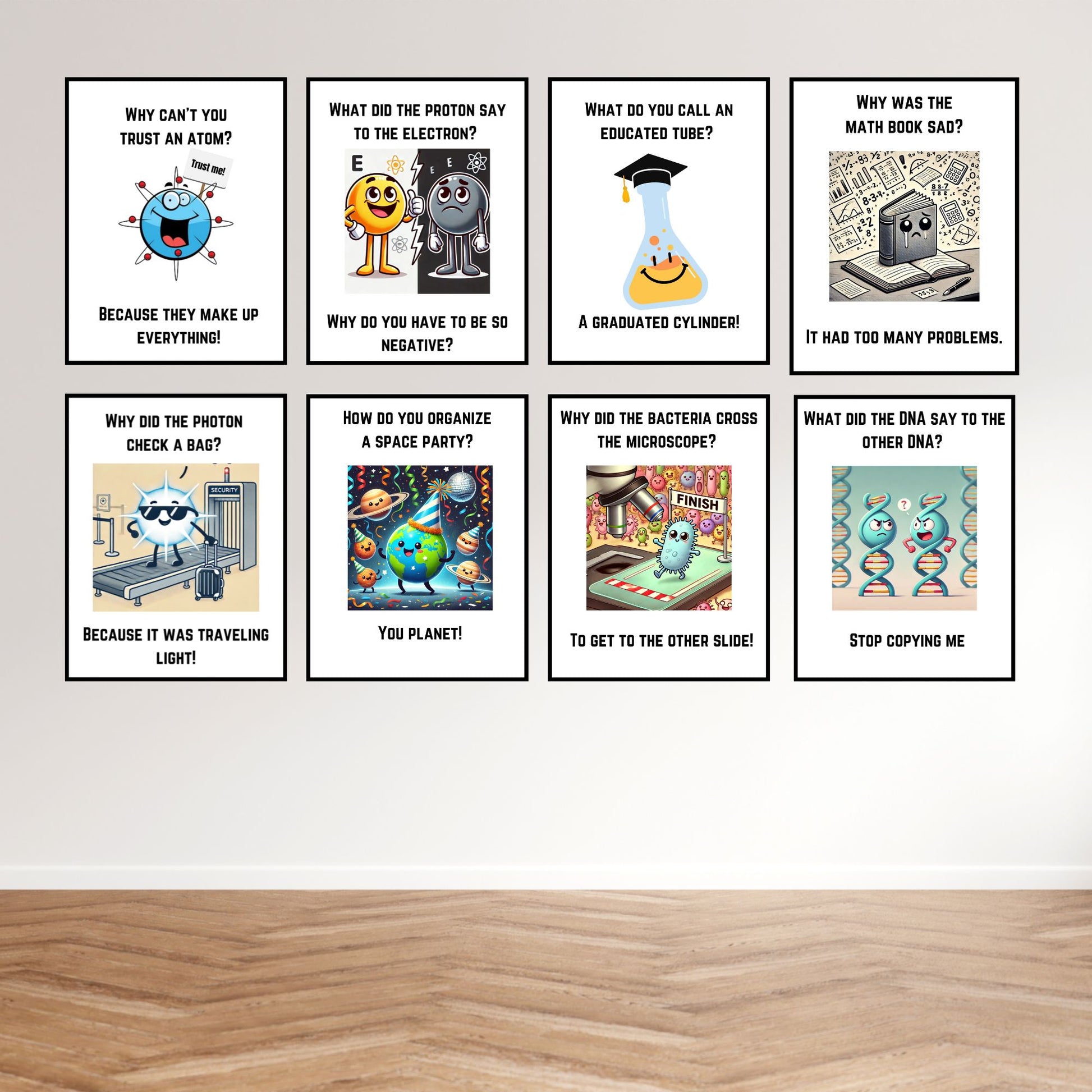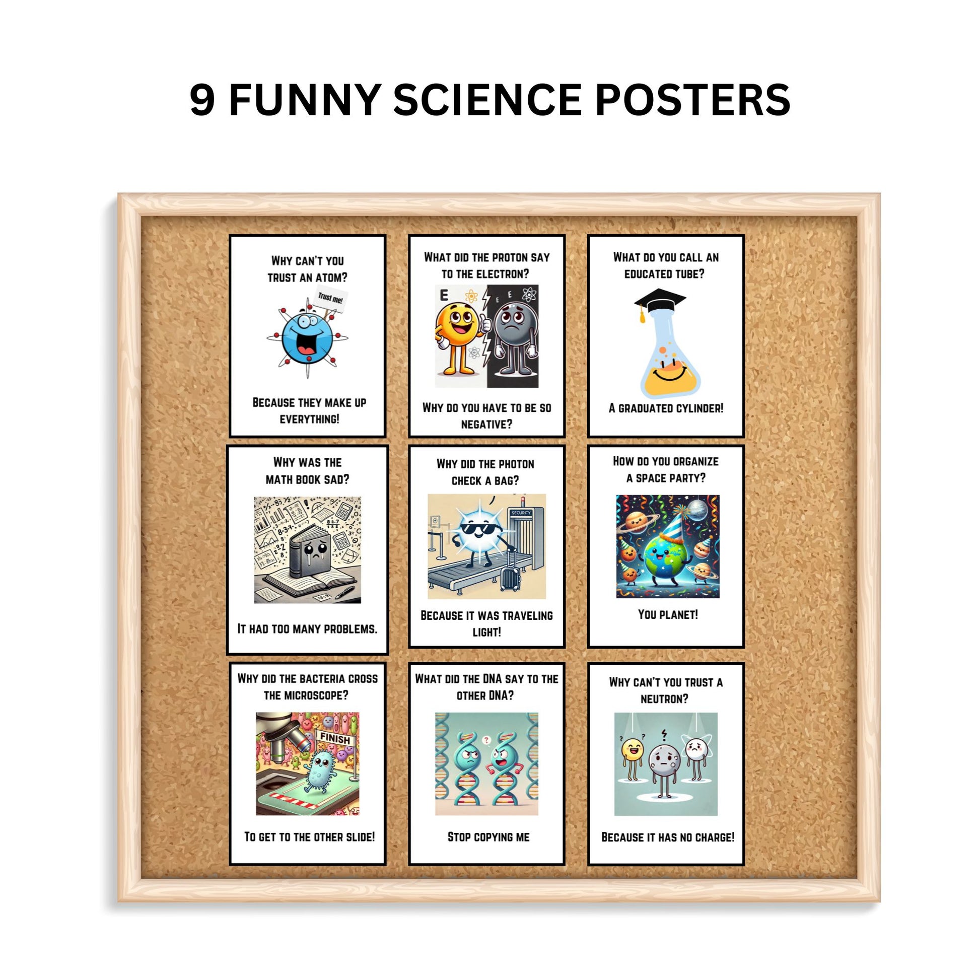 9 Unique Posters: Each poster showcases a different science joke with a matching funny illustration to capture attention and inspire curiosity.