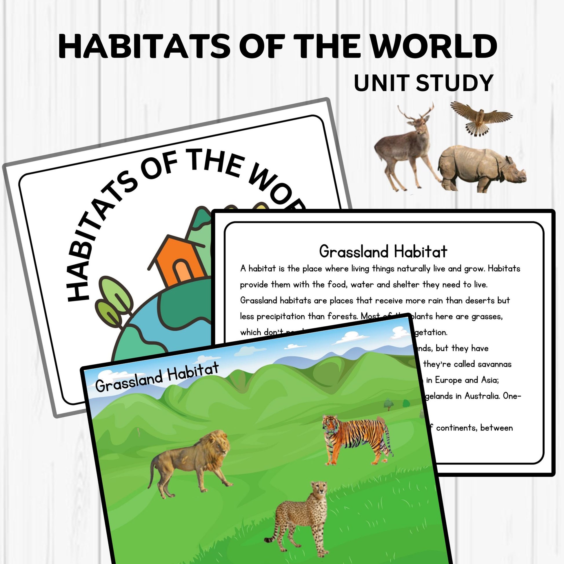 Habitats of the World printable unit study that helps students learn about different habitats around the world. This learning pack is a complete unit with introduction to different habitats and the animals that live in it.