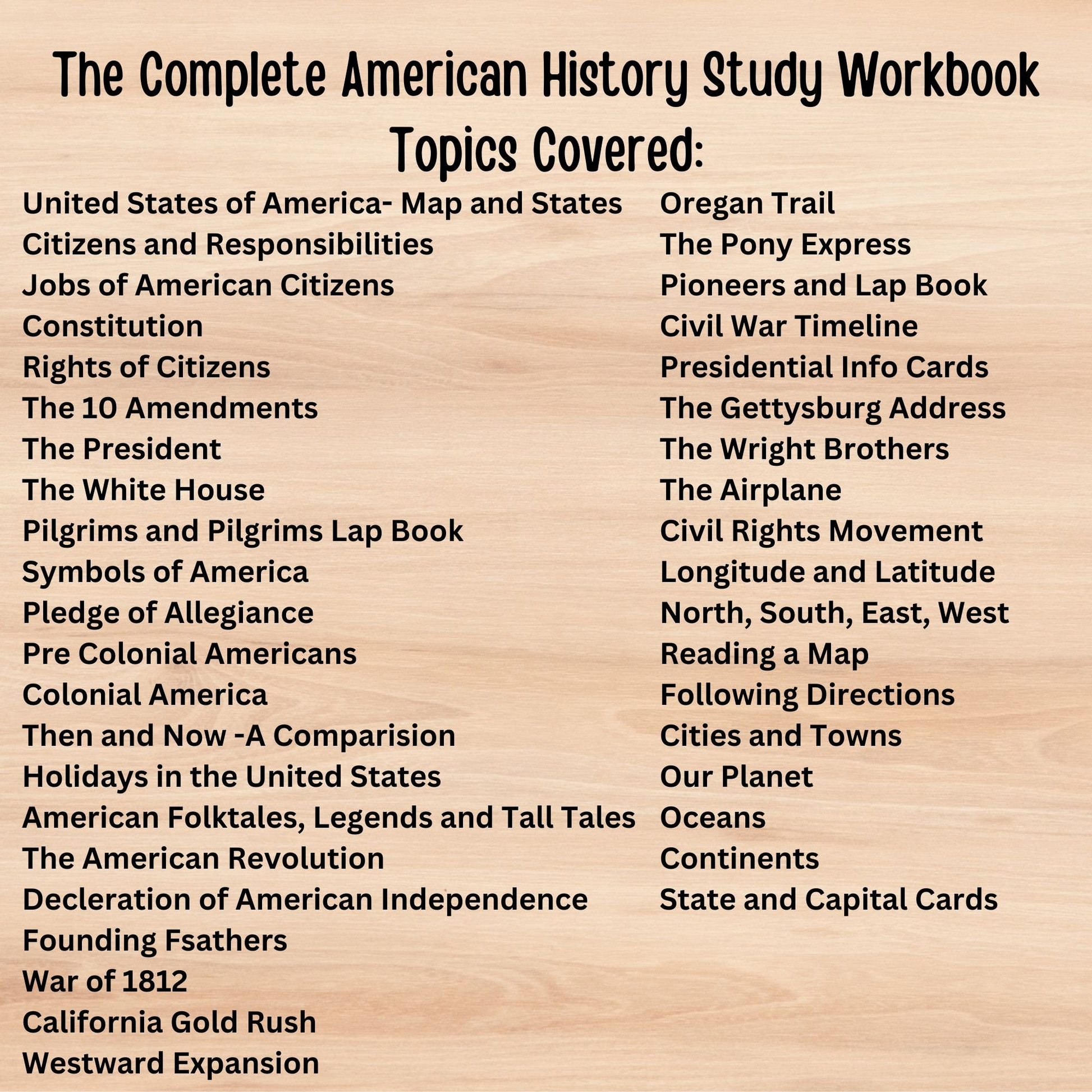 This is a complete study workbook for United States History. This workbook will help your child build his/her knowledge about America. It contains 211 pages which contains the complete curriculum for American History. It is a great Homeschool Resource. This Workbook comes with Activities to help making learning History Fun!