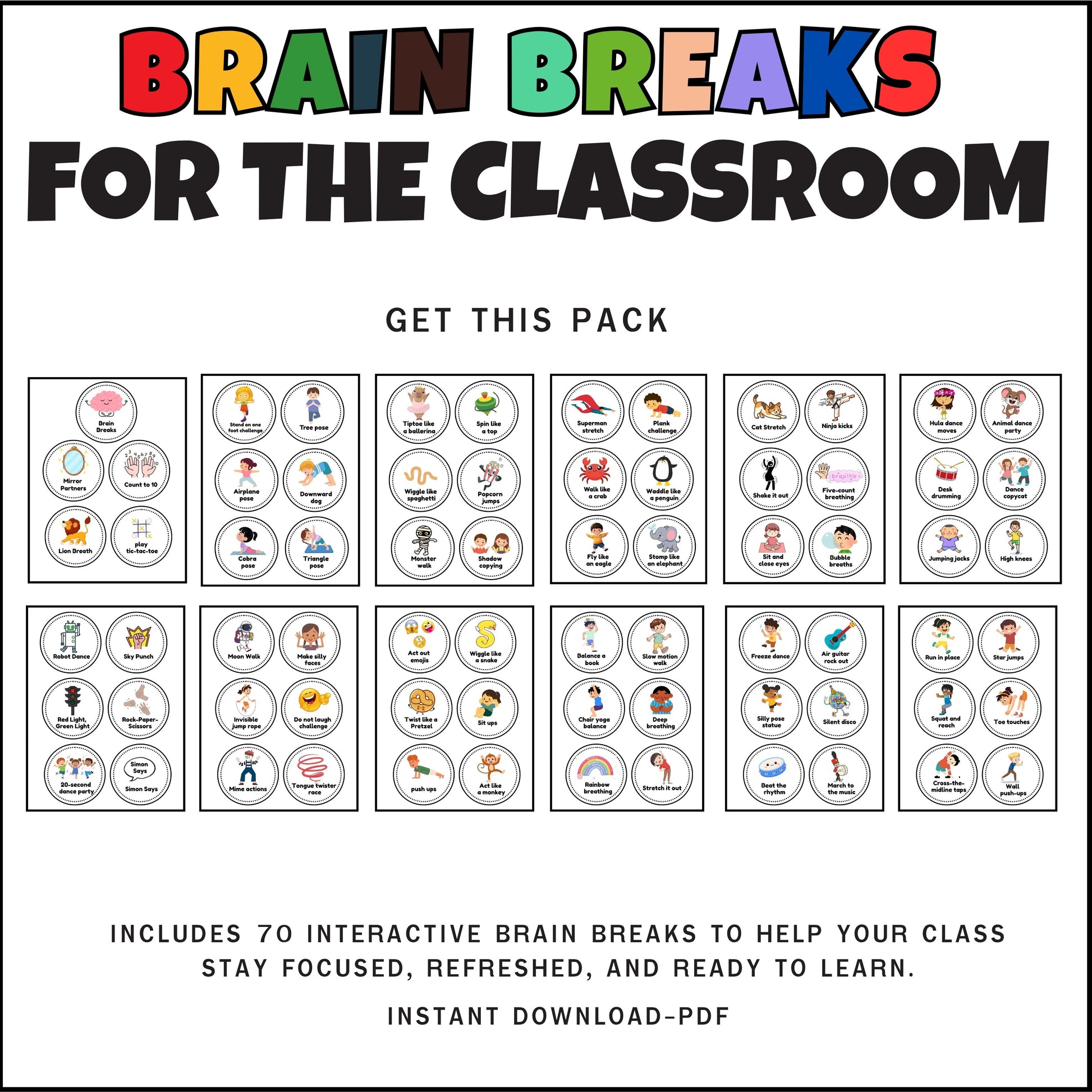 70 engaging Brain Break Cards for movement, focus, and calm-down activities.