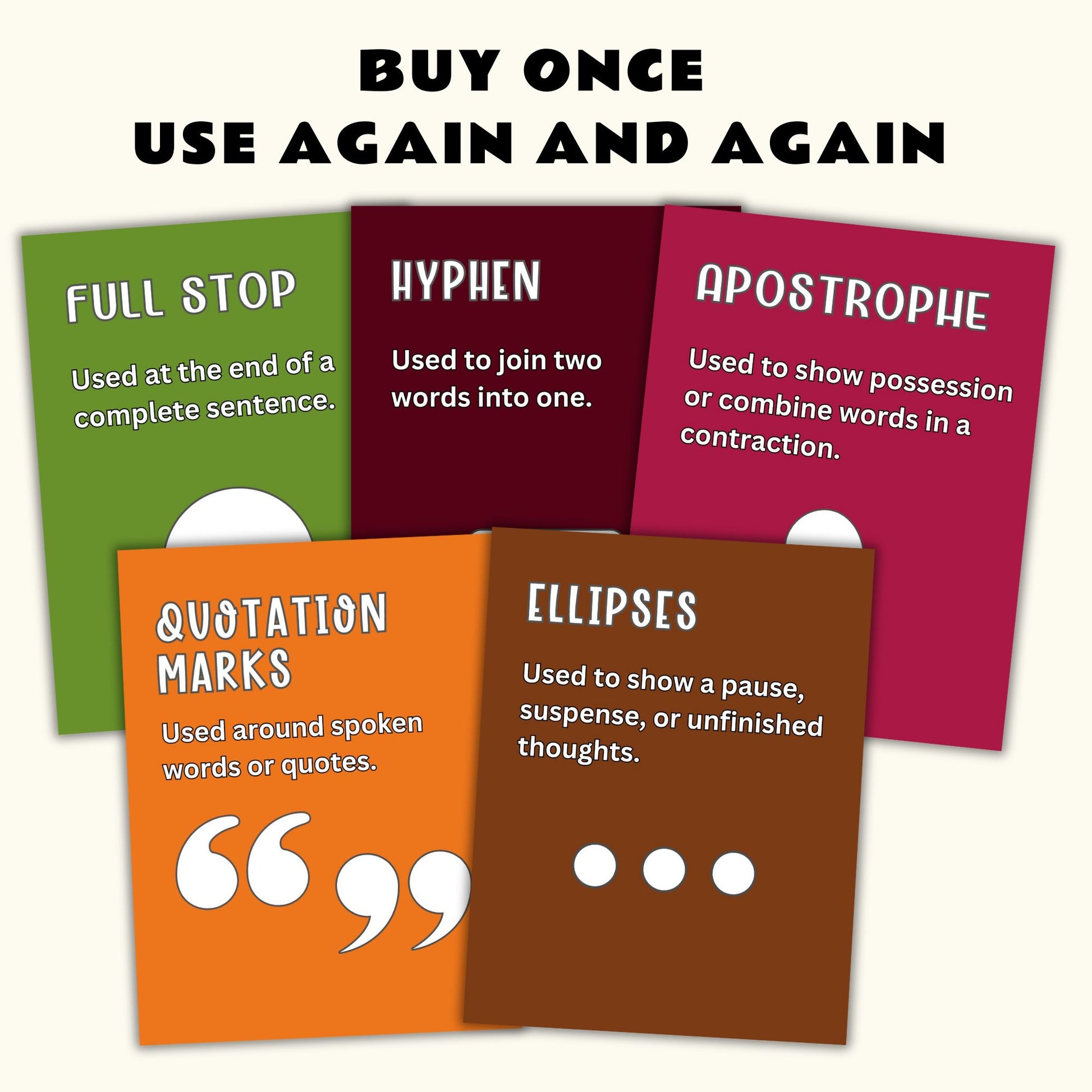 Make punctuation fun and easy to understand with this set of 12 punctuation posters! Perfect for English classrooms, homeschool settings, and literacy centers, these posters help students grasp punctuation rules with clear explanations and visuals.