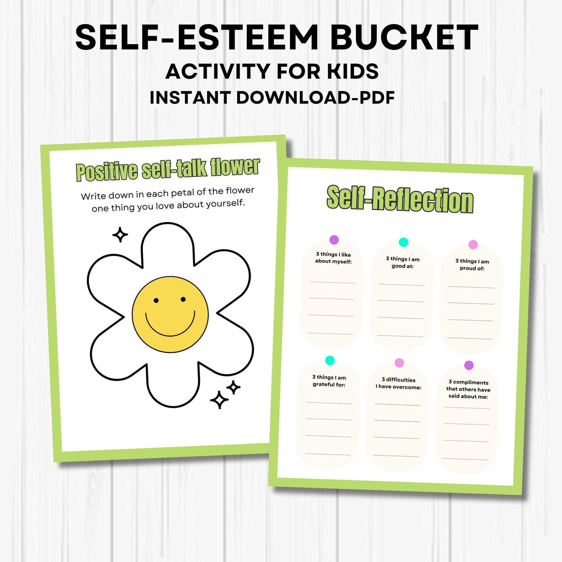 Self-Reflection Sheet: A guided worksheet that encourages kids to think about their feelings and actions, helping them recognize how they can mend any holes in their self-esteem bucket. This sheet prompts them to write about times they felt proud, how they handled challenges, and what they can do to keep their self-esteem strong.
