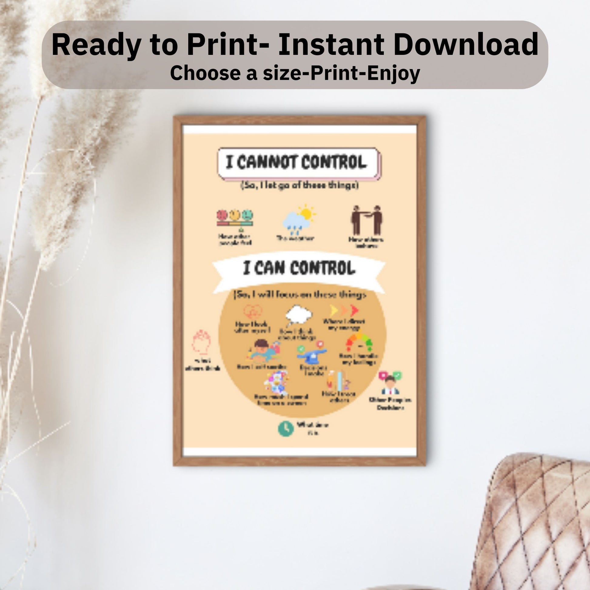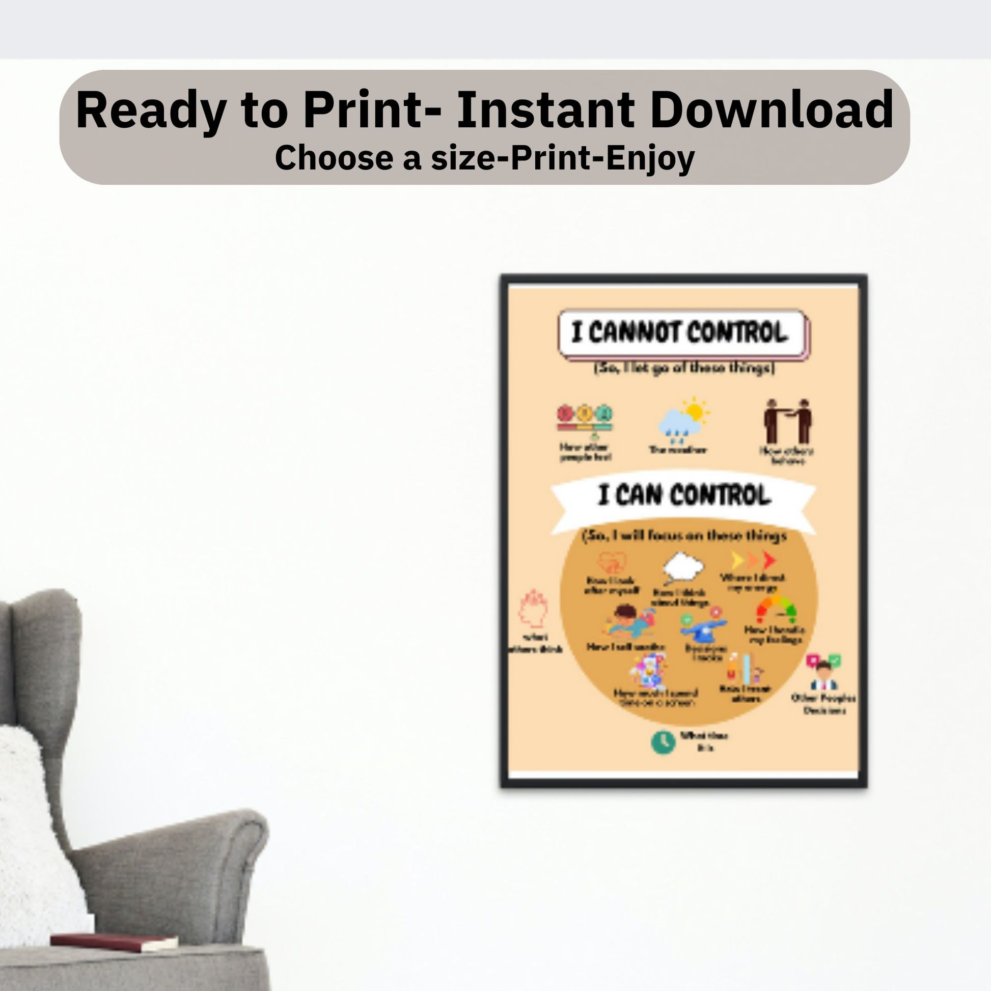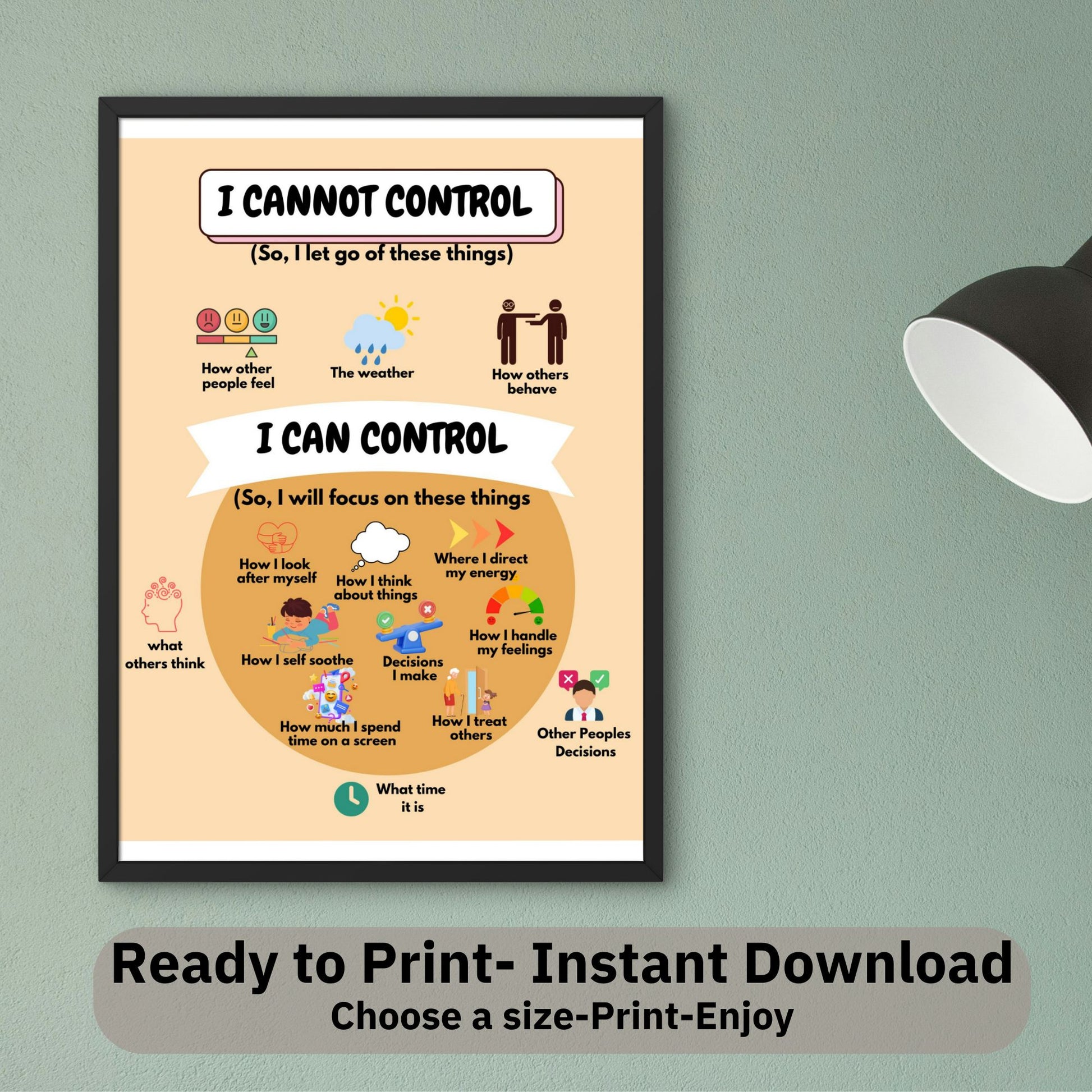 This calming and informative wall art is ideal for classrooms, therapy offices, and any space where a gentle reminder is needed. By distinguishing between what we can control and what we can't, this poster serves as a practical resource for anyone facing anxiety, depression, or daily stress.