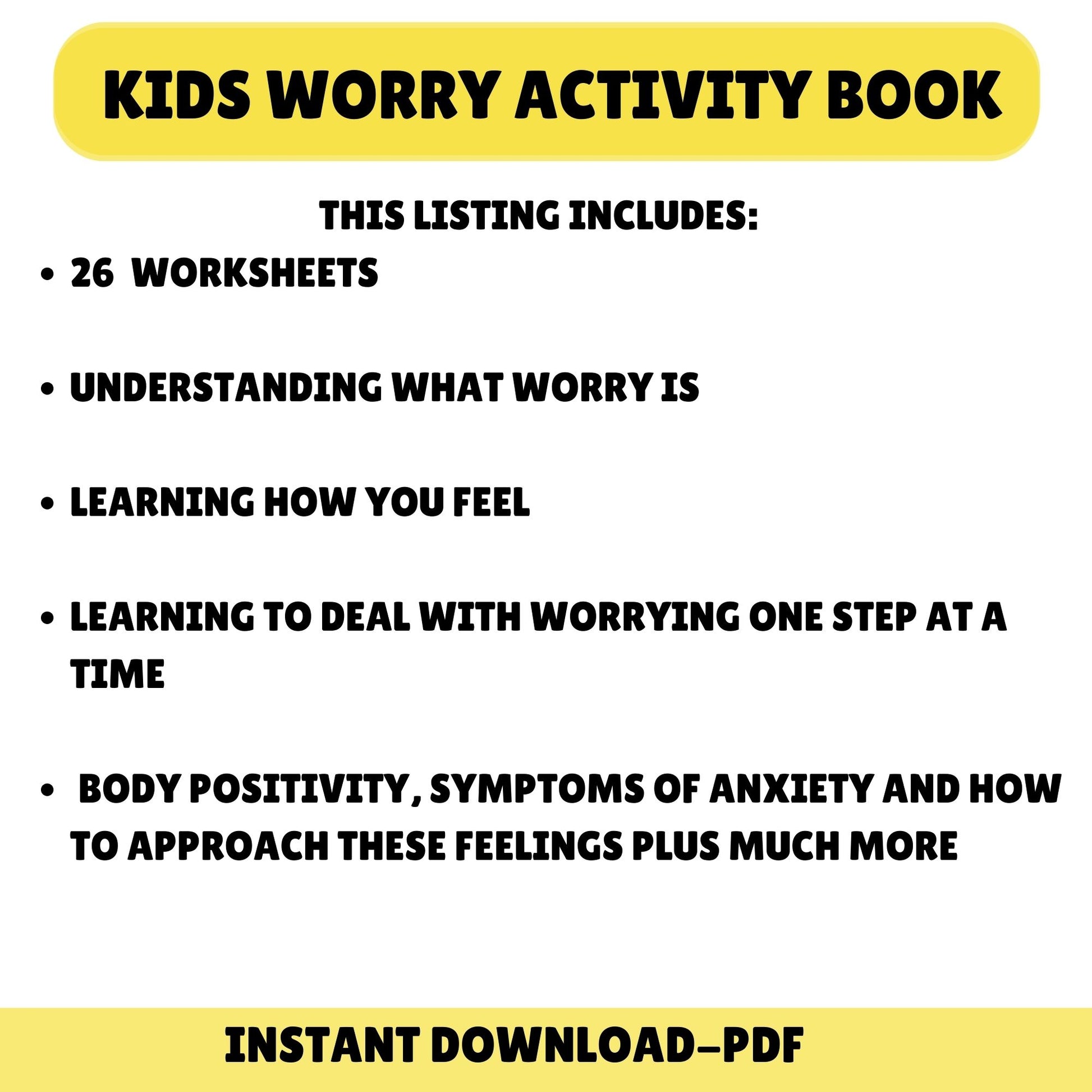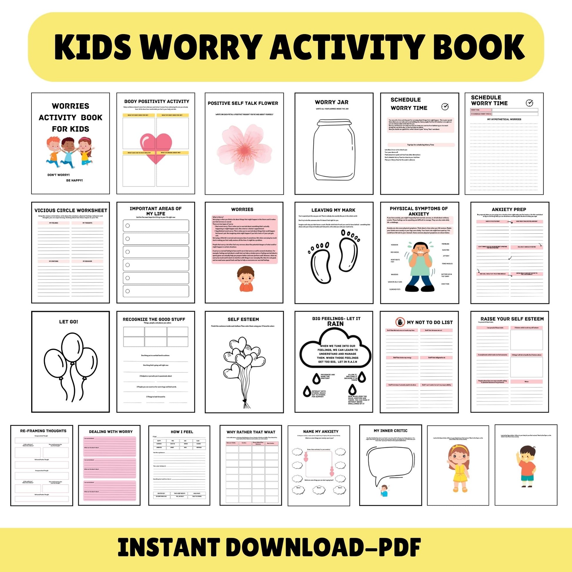 Kids worries printable activity book is a comprehensive set of anxiety management worksheets, anxiety journal kids, and worry workbook kids to help your child manage their anxiety. This handy resource has been designed specifically for children and can be used in schools as well as home.